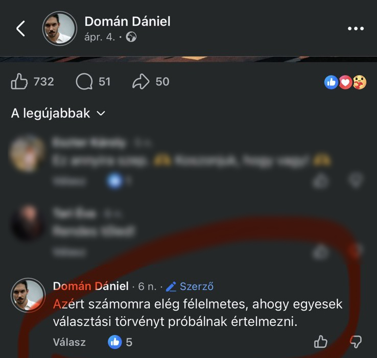 A Nemzeti Választási Bizottság 312/2026. számú határozatában megállapította, hogy Domán Dániel megsértette a választási eljárás szabályait egy, a közösségi médiában közzétett bejegyzésével. A testület a kifogásnak helyt adott, és a politikust eltiltotta a további jogsértéstől, egyúttal kötelezte a kifogásolt tartalom azonnali eltávolítására.