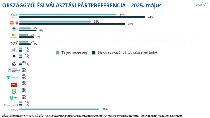 Ha 2025 májusának közepén országgyűlési választásokat tartottak volna Magyarországon, a legtöbben a TISZA Pártra szavaztak volna – derül ki az IDEA Intézet friss, országosan reprezentatív kutatásából. A felmérést május 15. és 23. között végezték, kérdőíves módszerrel.
