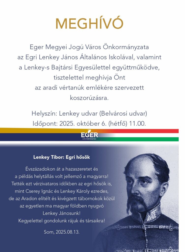 Egerben az önkormányzat a hagyományokhoz hűen 11 órakor a Lenkey-szobornál, a Belvárosi-udvarban tartja a koszorúzással egybekötött városi megemlékezést.
